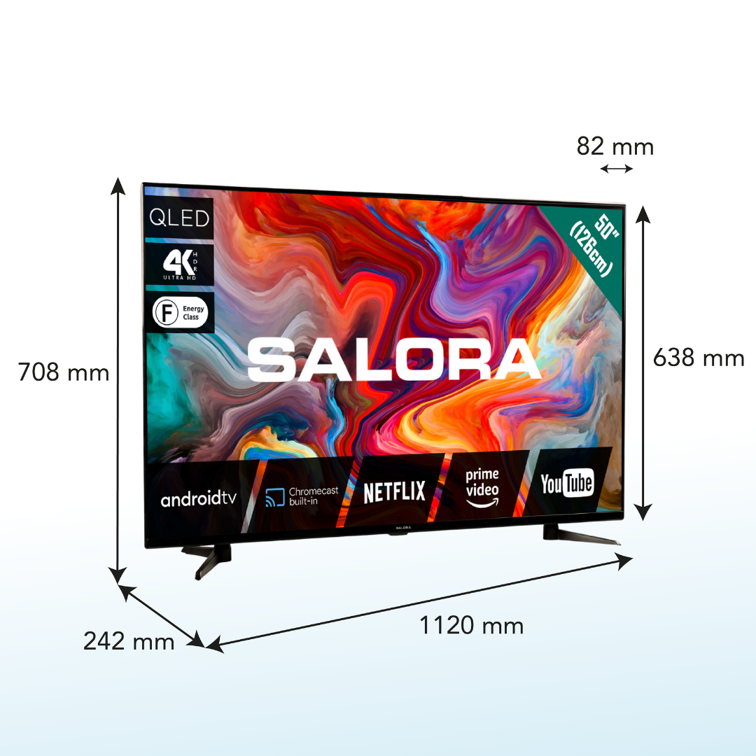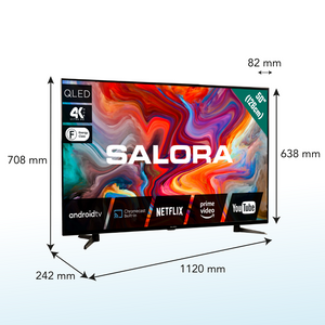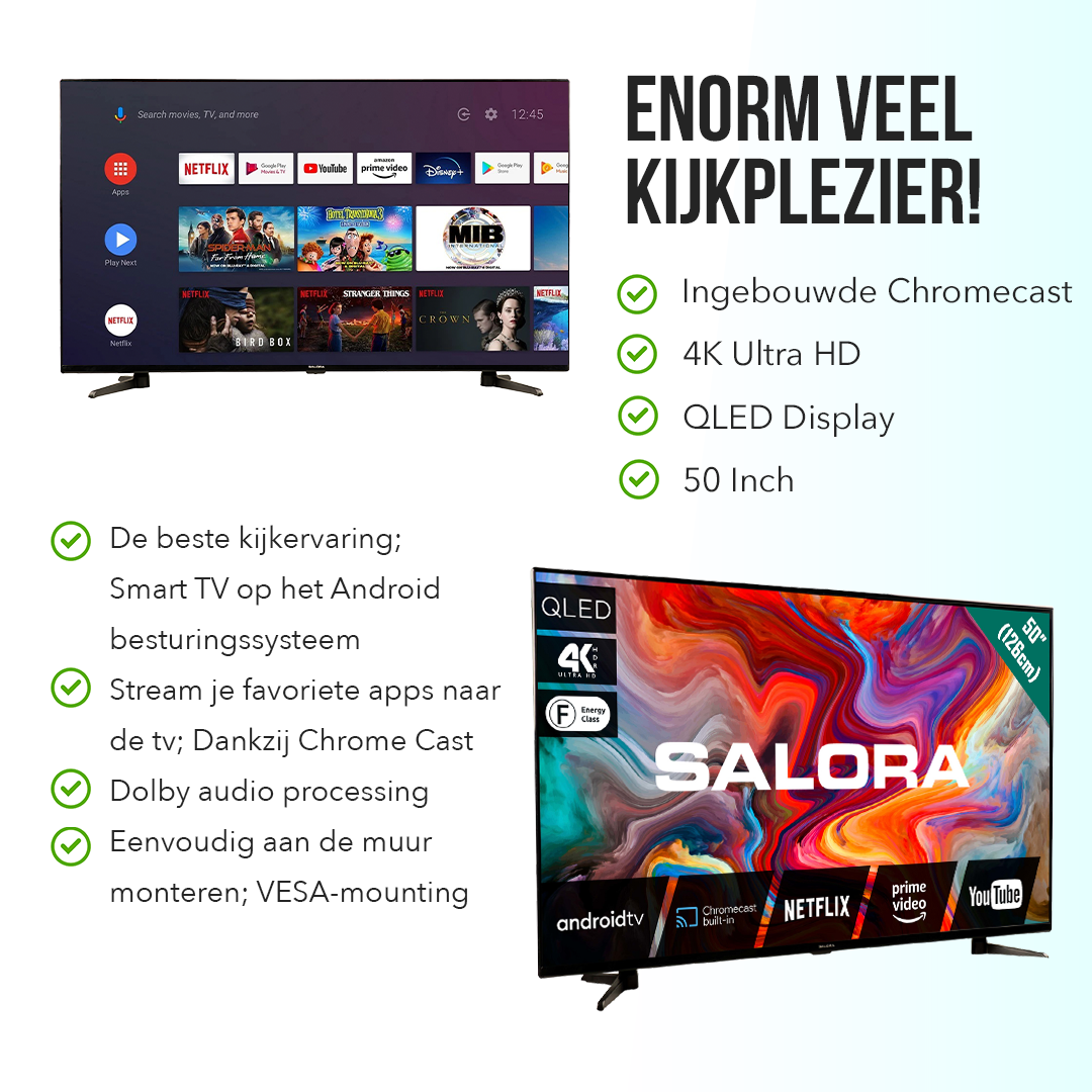 Mit dem Salora 50QLEDTV erhalten Sie das beste Seherlebnis Ihrer Lieblingsserien von Netflix und Ihrer besten TV-Programme. Dieser 50QLEDTV hat eine Bildschirmdiagonale von 50 Zoll (126 cm). Darüber hinaus ist dieser Smart-TV mit 4K-Bild ausgestattet. HDR10 und HLG. Dadurch wird die Farbdarstellung sehr genau. Dieser Fernseher ist standardmäßig mit Netflix ausgestattet. Youtube und Amazon Prime. Suchen Sie nach einer Streaming-Option? Mit dem 50QLEDTV ist das kein Problem, da Sie mit dem integrierten Google Chromecast ganz einfach Ihre eigenen Inhalte auf diesem Fernseher streamen können.
