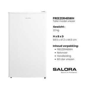 Zoek je een kleine maar slimme vriezer voor keuken, bijkeuken, kantoor of studentenhuis? De Salora FREEZER48WH biedt 60 liter inhoud in een strak tafelmodel. Drie lades helpen je voorraad overzichtelijk te bewaren en de temperatuur regel je eenvoudig met de draaiknop.
