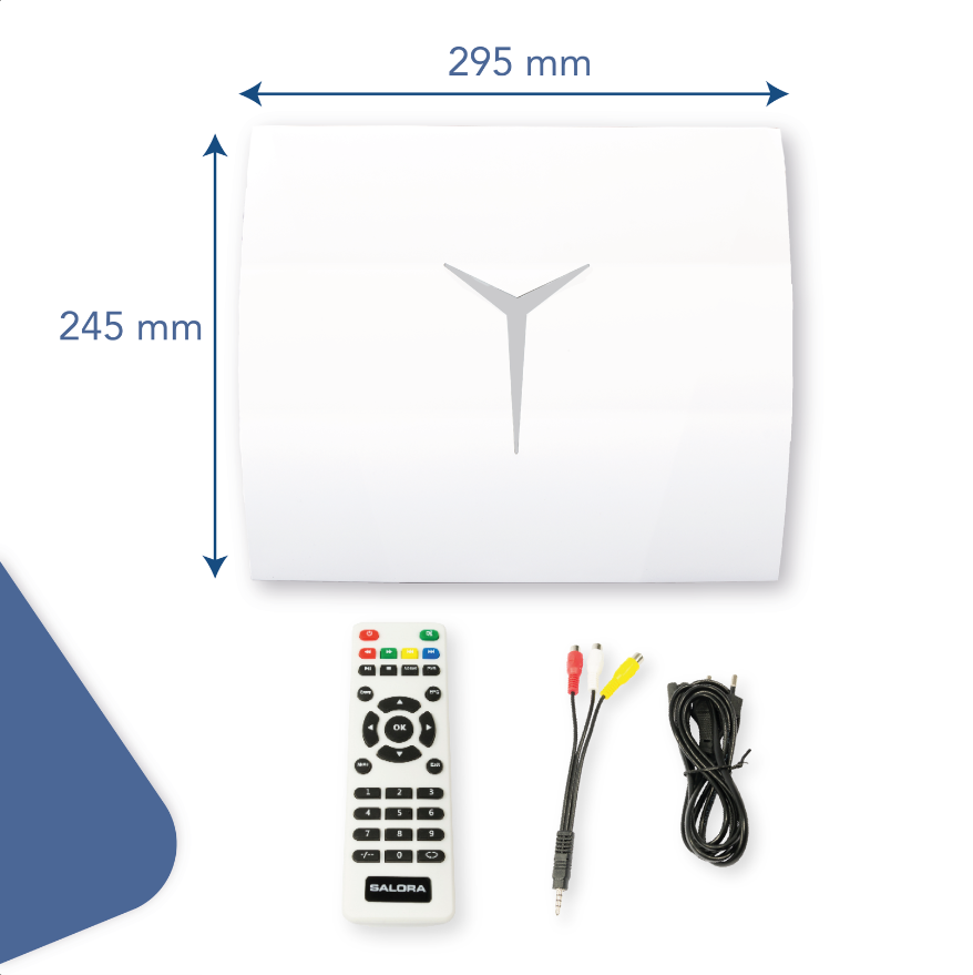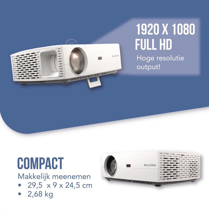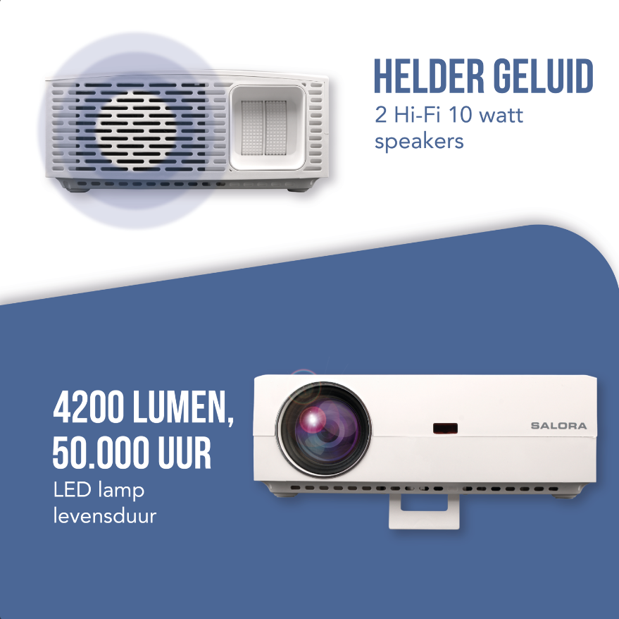 Mit 295 mm x 90 mm x 245 mm und einem Gewicht von 2,68 kg ist der Salora 60BFM4250 Projektor ein kompakter Projektor, den Sie problemlos überall hin mitnehmen können. als würde man gemeinsam ein Spiel auf höchstem Niveau verfolgen. Oder auf dem Campingplatz, um einen schönen Abend im Heimkino in gemütlicher Atmosphäre zu verbringen.