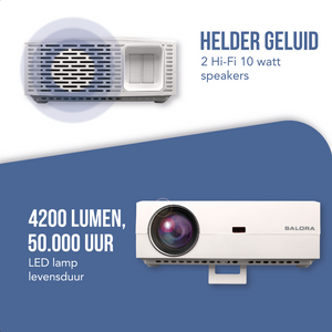 Mit dem Beamer Salora 60BFM4250 erhalten Sie ein erstklassiges Seherlebnis! In dunklen Räumen liefert der Projektor aufgrund des dynamischen Kontrastverhältnisses von 15.000:1 und einer Linse, die mit 4.200 Lumen ausgestattet ist, ein hochwertiges Bild. die eine Ausgabe von 1920x1080 p hat. Alles, damit Sie die gestochen scharfen Projektionen genießen können.