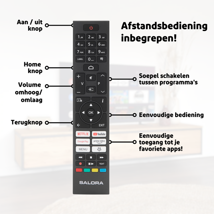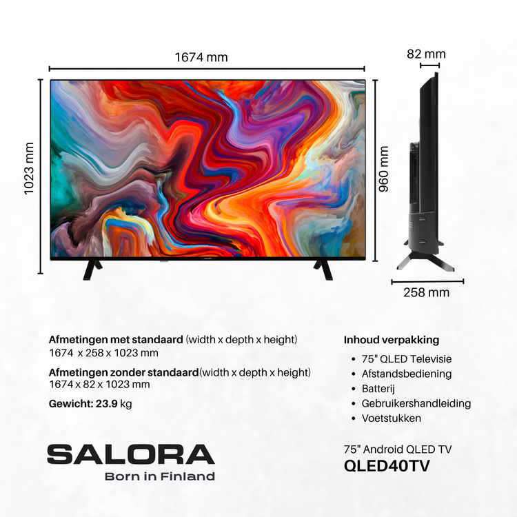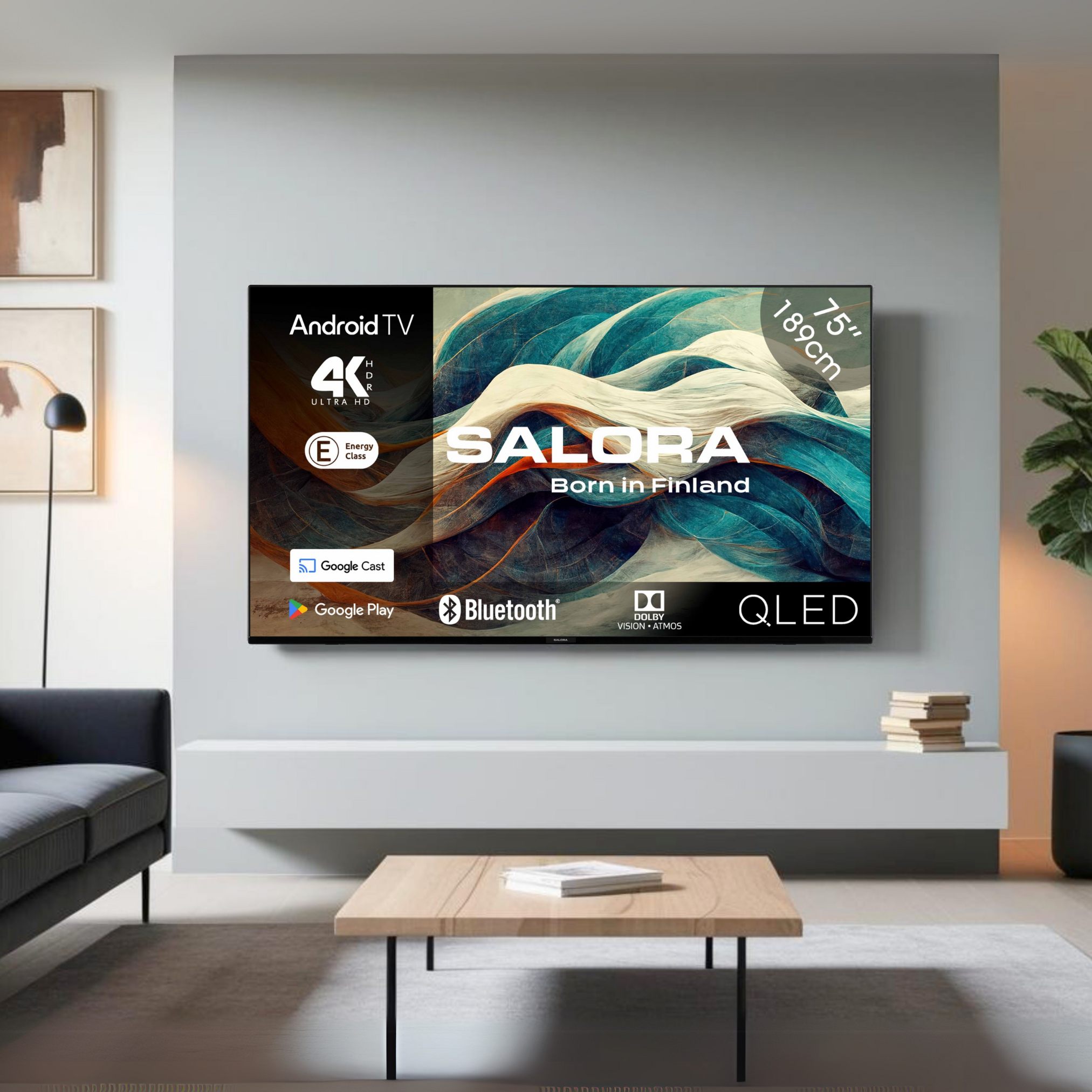 De Salora 75QLED320 combineert indrukwekkende beeldkwaliteit met slimme technologie en een stijlvol design. Ideaal voor liefhebbers van films, series en gaming die op zoek zijn naar een groot scherm met premium prestaties.