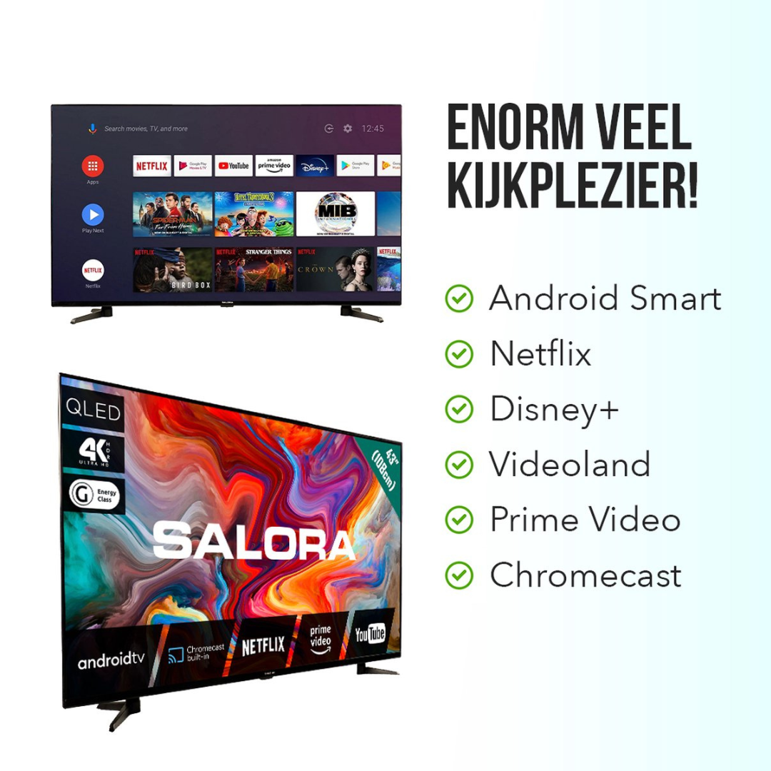 Der Salora-Fernseher verfügt standardmäßig über integriertes WLAN, mit dem Sie eine Verbindung zum Internet herstellen können. Dank des integrierten Google Chromecast können Videos ganz einfach über Ihr Smartphone gestreamt werden. Auch dieser Smart-TV verfügt standardmäßig über Netflix-Apps. YouTube und Amazon Prime installiert. Auf diese Weise können Sie ganz einfach Ihre Lieblingsfilme und -serien ansehen. Weitere Apps und Spiele können Sie über die Android TV-Plattform von Google herunterladen. Nutzen Sie den Fernseher als kabellosen Lautsprecher, indem Sie ein Smartphone über Bluetooth verbinden.