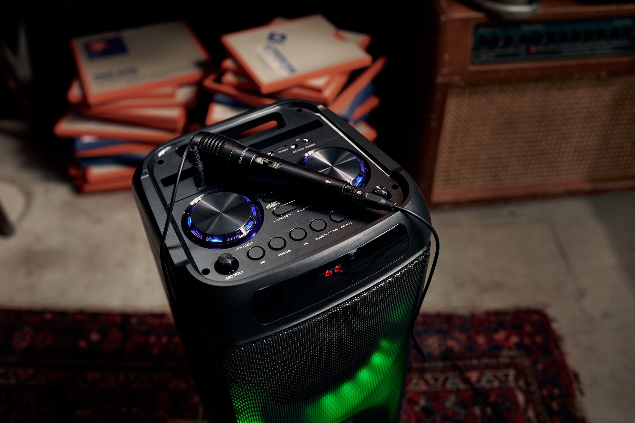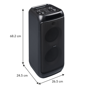 Met de 2 woofers met een diameter woofer van: 16,5 cm (6"5) komt er een prachtig geluid uit de speaker. De party speaker beschikt over een meegeleverde microfoon, hiermee creëer je jouw eigen karaoke avond. Muziek speel je af via Bluetooth, AUX of via een Usb stick.